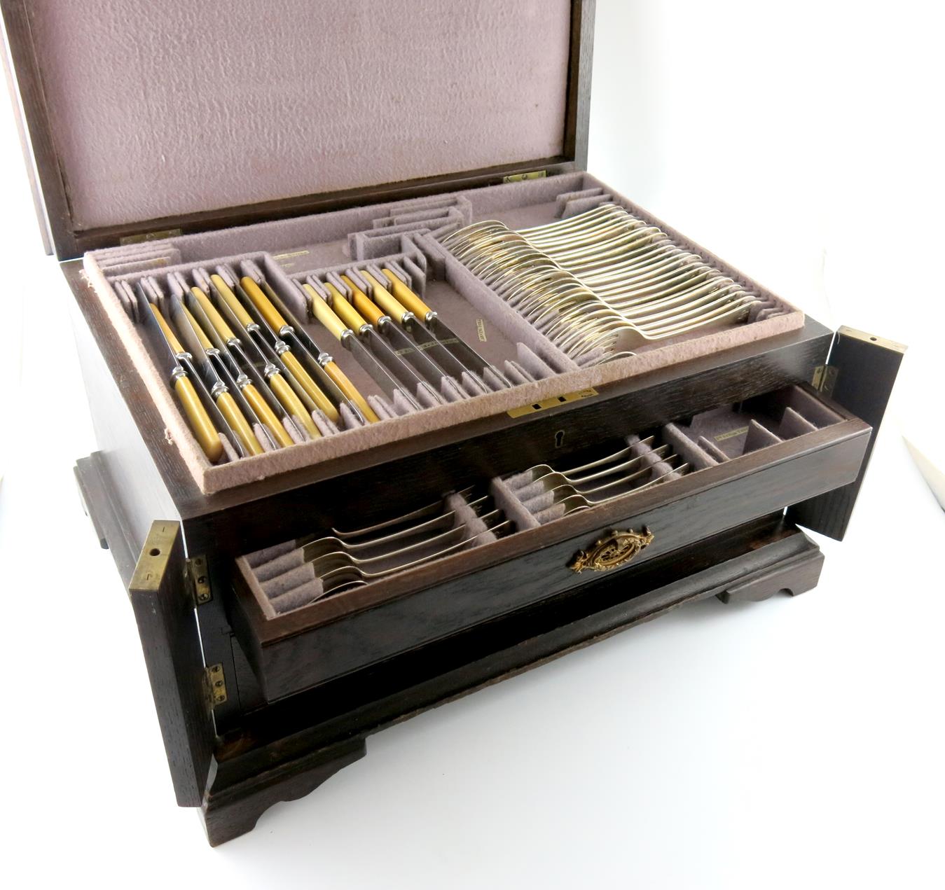 comprising: Twenty-three table forks, plus one by a different maker, London 1893, two pickle forks, a sugar sifting spoon, a cheese scoop, jam spoon, a pair of sugar tongs, six teaspoons, twelve ice cream spoons with gilt bowls, butter knife, twelve dessert forks, twelve dessert spoons, a basting spoon, two sauce ladles, twelve soup spoons, eleven tablespoons, plus twelve ivory handled table knives and six various ivory handled dessert knives, in a fitted wooden case, approx. weight 193oz. (qty)