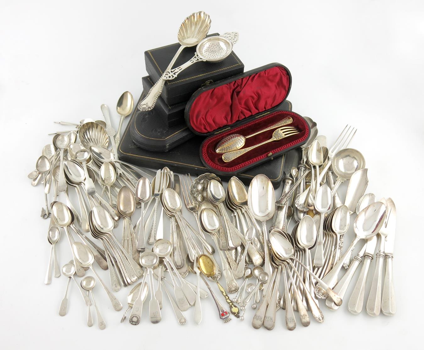 comprising: a cased silver cream ladle and sugar sifting spoon, a cased silver-gilt Fern pattern fork and spoon, a sauce ladle, two fish knives and forks, a ladle, a sugar sifting spoon, three Grecian pattern teaspoons and butter knife, a tea strainer, a lobster pick, a fruit serving spoon, a French five-piece table setting for one, seven King's pattern teaspoons, three sets of six teaspoons, two sets of five teaspoons, a matched set of six teaspoons, plus three grapefruit spoons, various condiment spoons, two miniature spoons, six butter knives, two cased sets and other items, approx. weighable 100oz. (qty)
