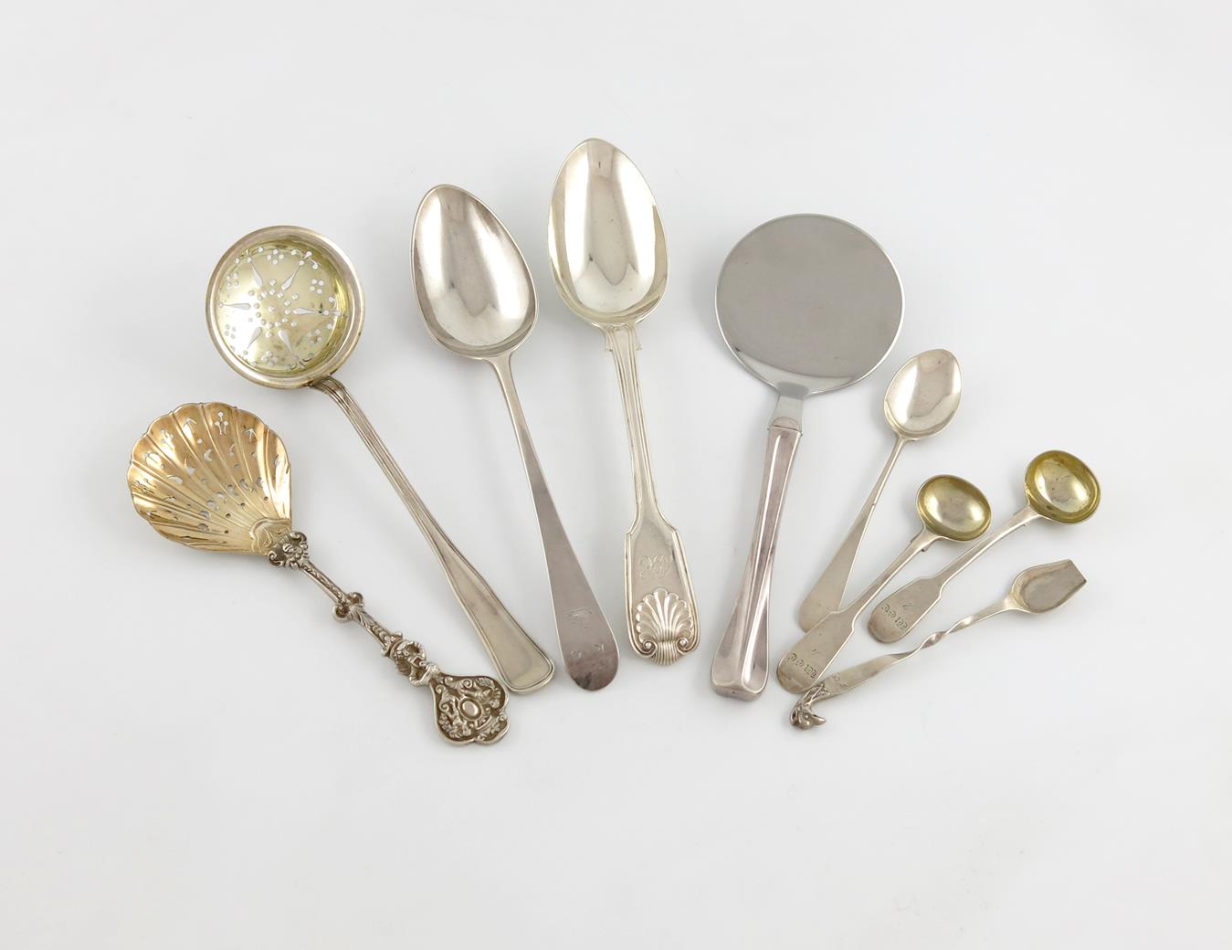 comprising silver items, a Fiddle, Thread and Shell pattern tablespoon, by Messrs. Lias, a late-Victorian spoon with a pierced bowl, by Mappin and Webb, London 1899, plus a tablespoon, two salt spoons, a Canadian spoon, a salt spoon with an eagle head terminal, a Danish sifting spoon and a Danish serving slice with a silver handle and stainless steel blade, approx. weight 10oz. (9)