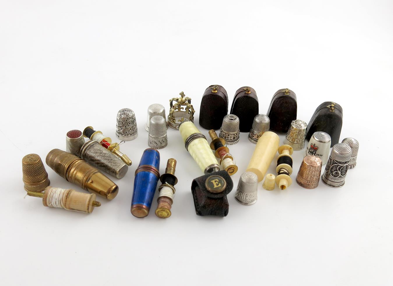 a George III thimble and scent bottle, by Joseph Taylor, Birmingham circa 1800, with filigree decoration, the screw-off base reveals the scent bottle, a commemorative thimble with an image of Wellington, a crown shaped thimble, a silver and enamel one, five cased thimbles, plus a silver and enamel cotton holder and thimble, and various cotton holders and thimbles, various materials, approx. weighable 2oz. (qty)