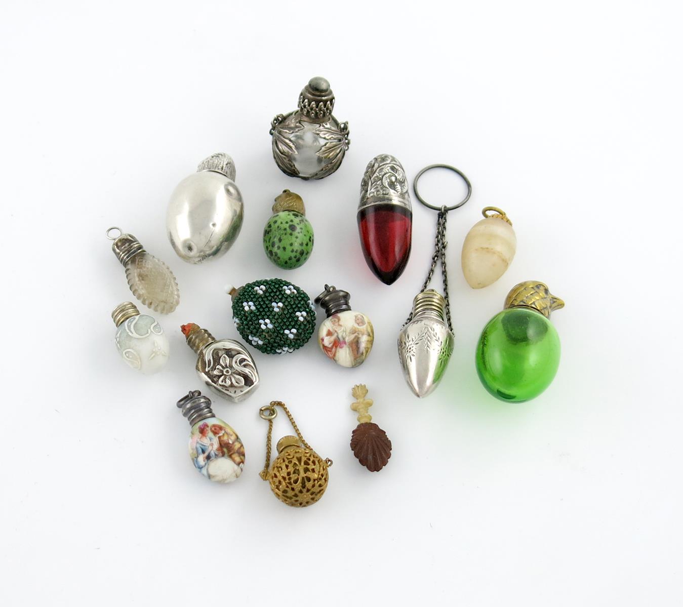 comprising: a late-Victorian one modelled as a chick's head emerging from an egg, Birmingham, marks worn, plus a base metal chicks head emerging from a green glass egg body, plus various other miniature scent bottles, various materials. (15)