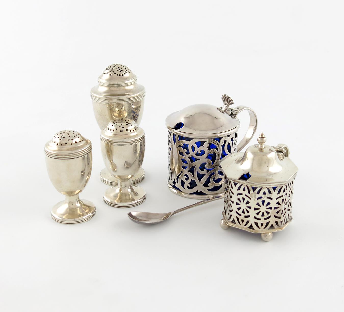 comprising: a pepper pot of urn form, on a raised circular foot, by John Emes, London 1805, plus a pair of Victorian pepper pots, London 1884, and two mustard pots, with pierced decoration, with one spoon, approx. weight 8.5oz. (6)