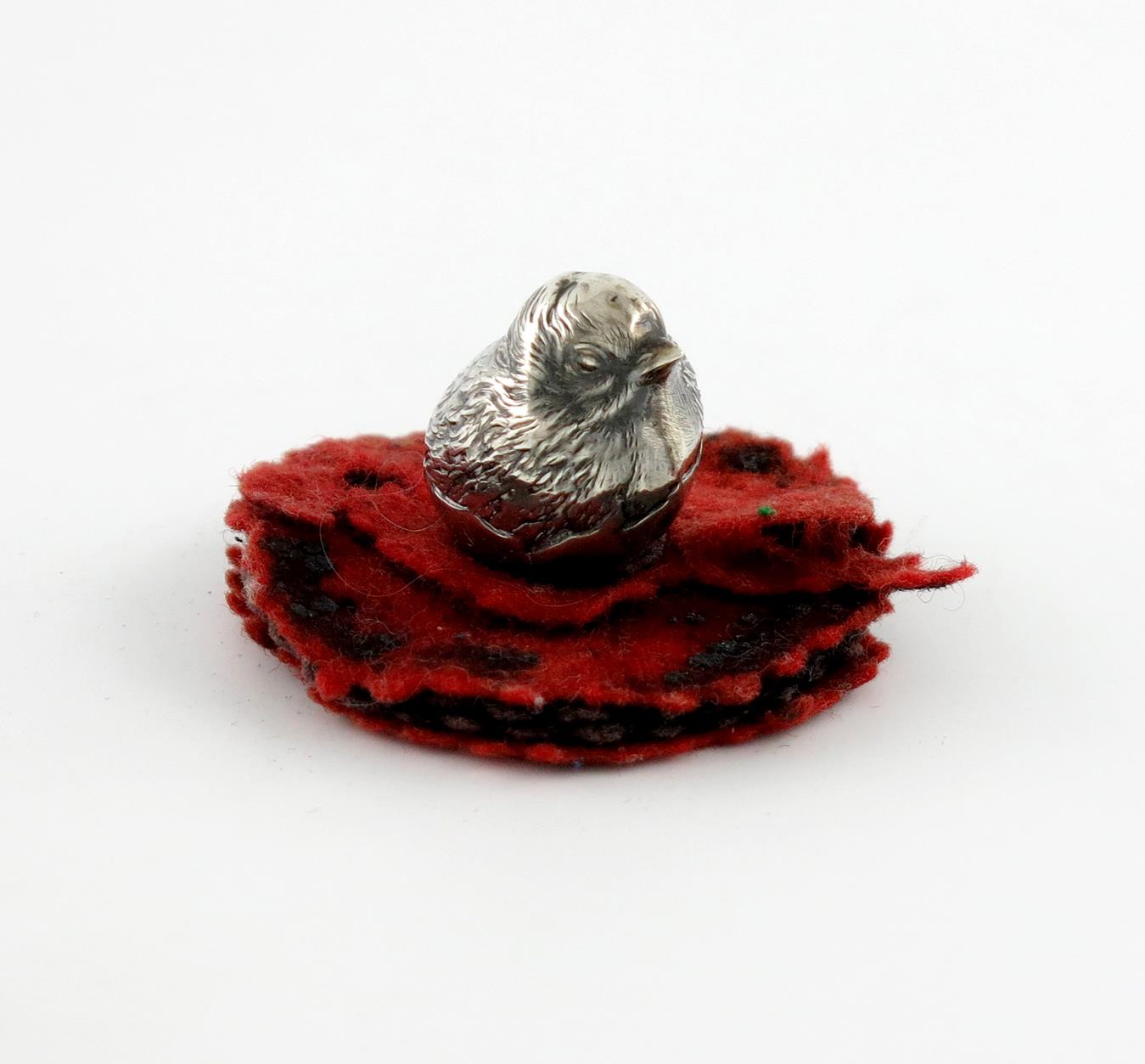 modelled as a chick emerging from an egg, on a felt pad, length of chick 3cm.