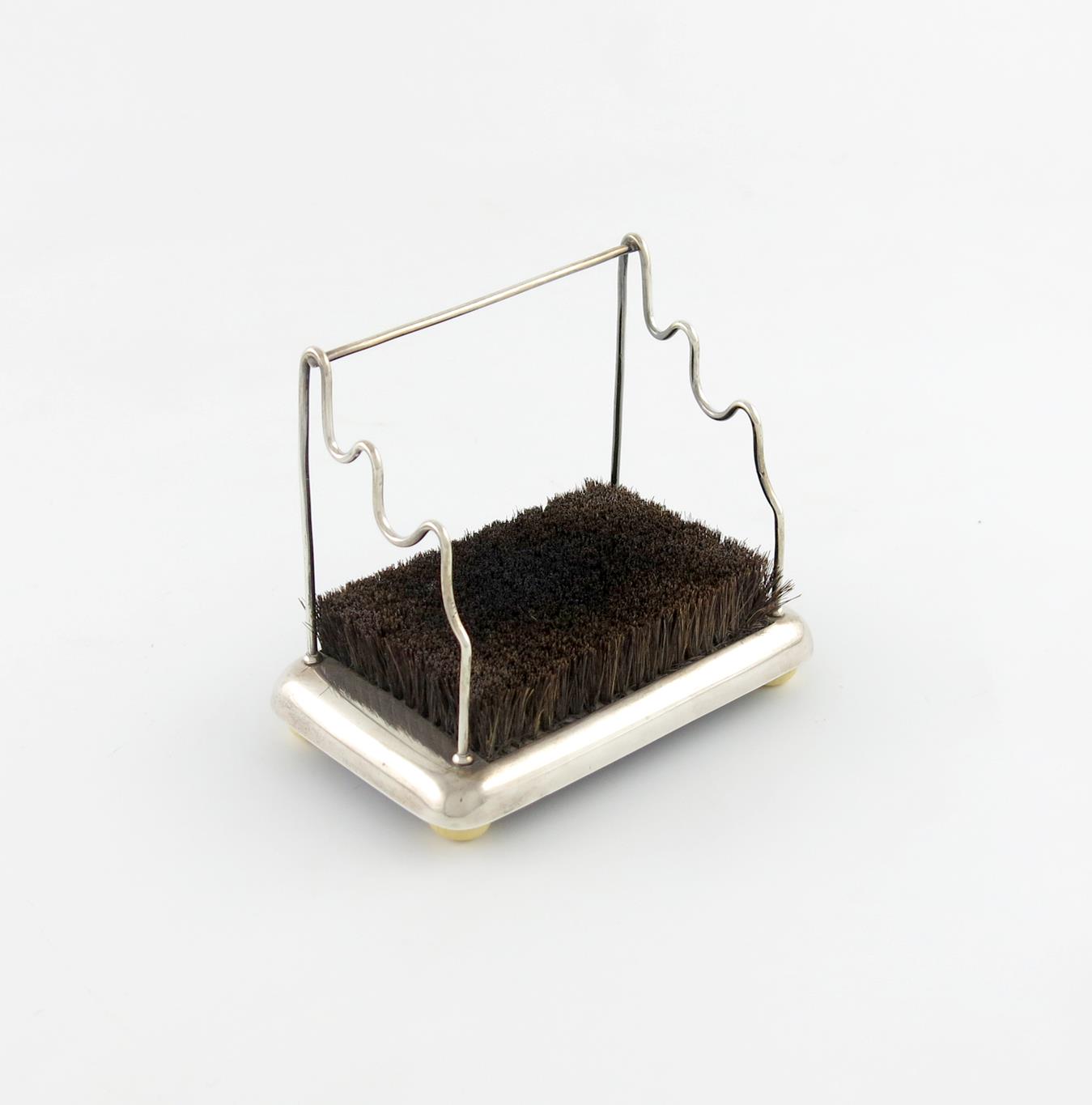 rectangular form, with a wire-work frame to hold two pens, set with bristles, on four ivory bun feet, length 12cm.