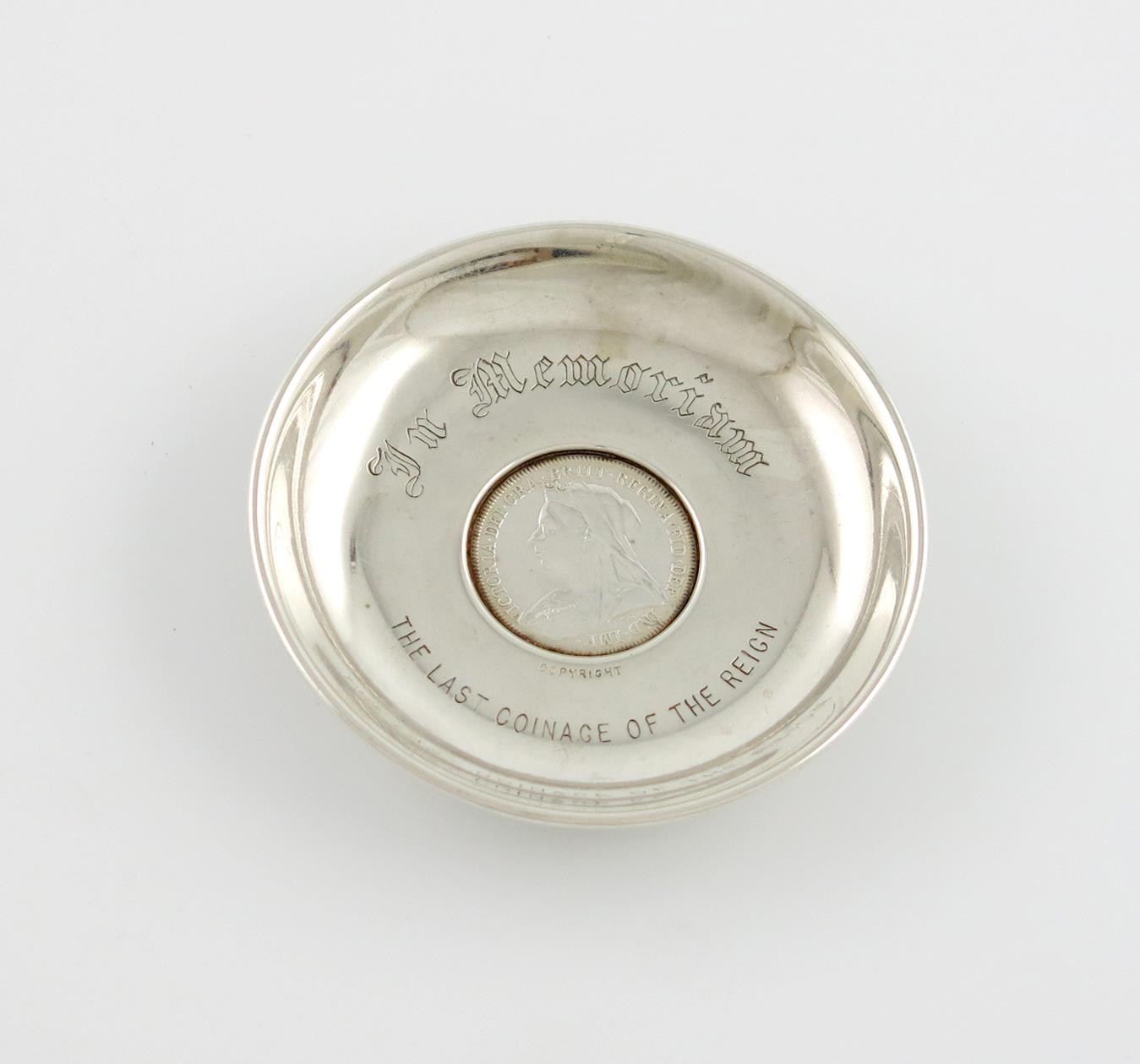 circular form, the centre set with a Victorian shilling, the front inscribed 'In Memoriam the last coinage of the Reign', diameter 6.7cm, approx. weight 0.7oz.