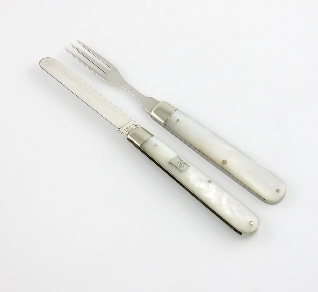 the plated steel blade by Singleton and Priestman, Sheffield, the two sections with a bayonet fitting, mother-of-pearl handles, engraved 'LUCY', length of knife open 14.4cm, closed 8cm.
