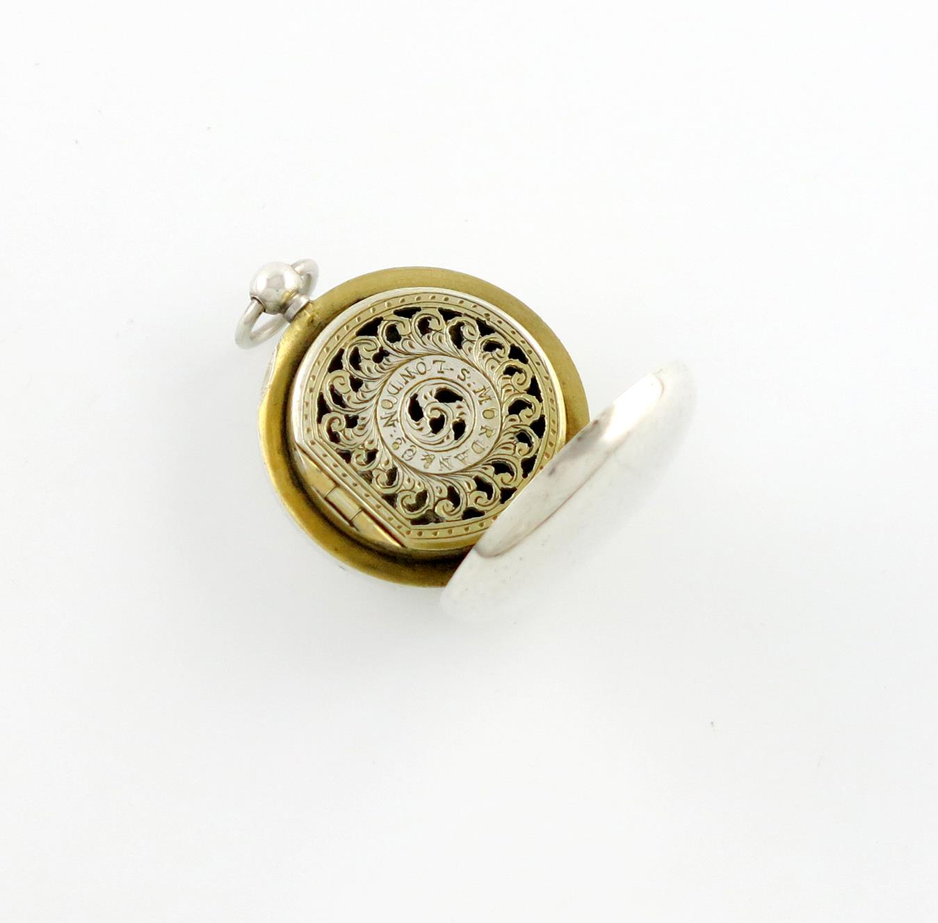 circular watch case form, the hinged cover opens to reveal a silver-gilt grille with pierced and engraved foliate scroll decoration, with a ring attachment, diameter 3.2cm, approx. weight 0.7oz.