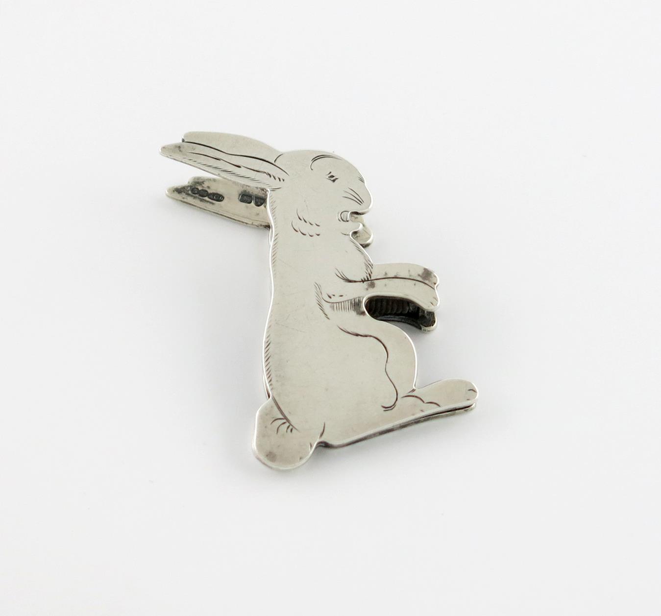 inspired by Benjamin Rabier, modelled as a seated rabbit with raised ears, in two sprung-hinged parts, length 5.3cm, approx. weight 1.2oz.