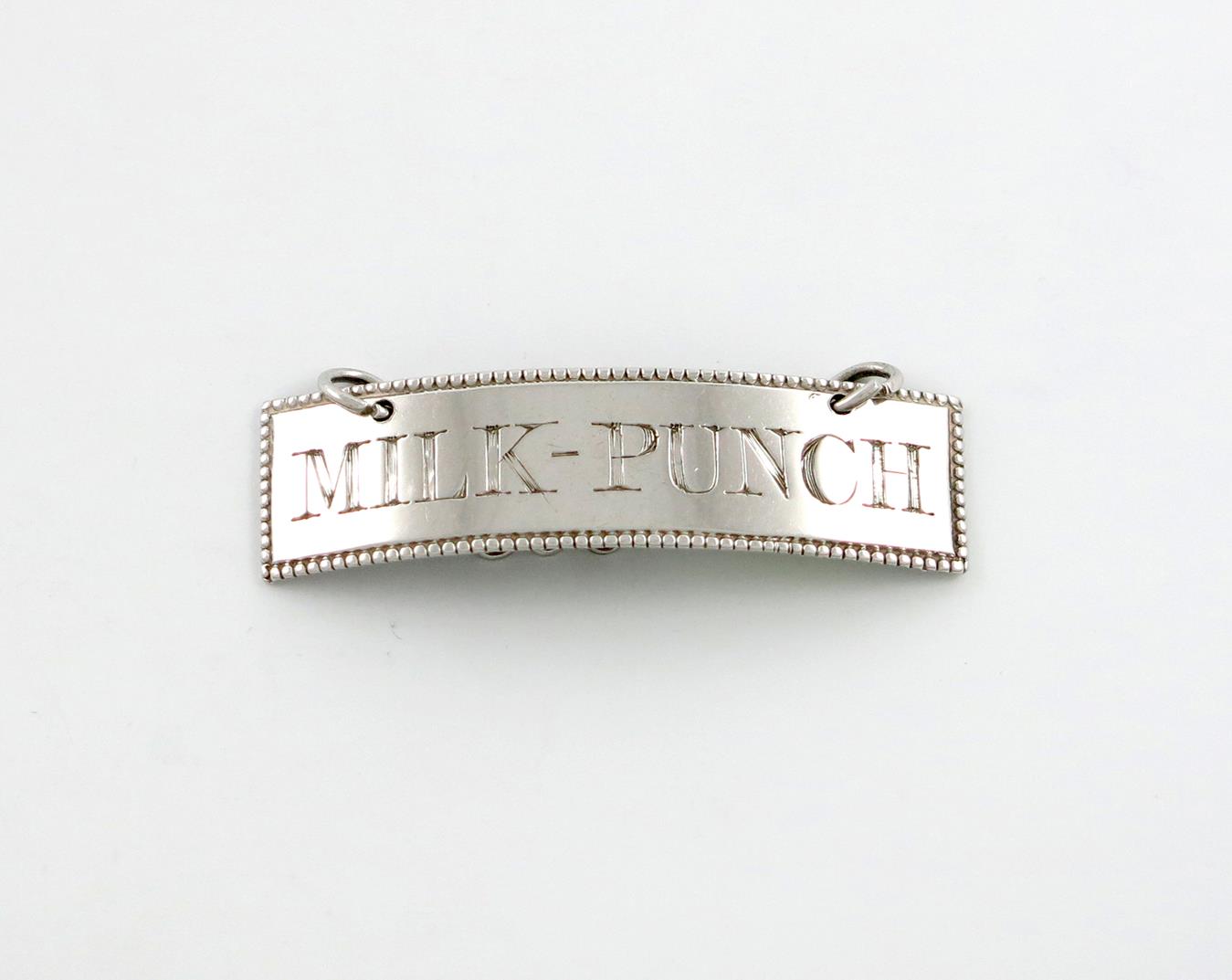 narrow rectangular form, beaded border, incised 'MILK-PUNCH', length 5.2cm, approx. weight 0.2oz.