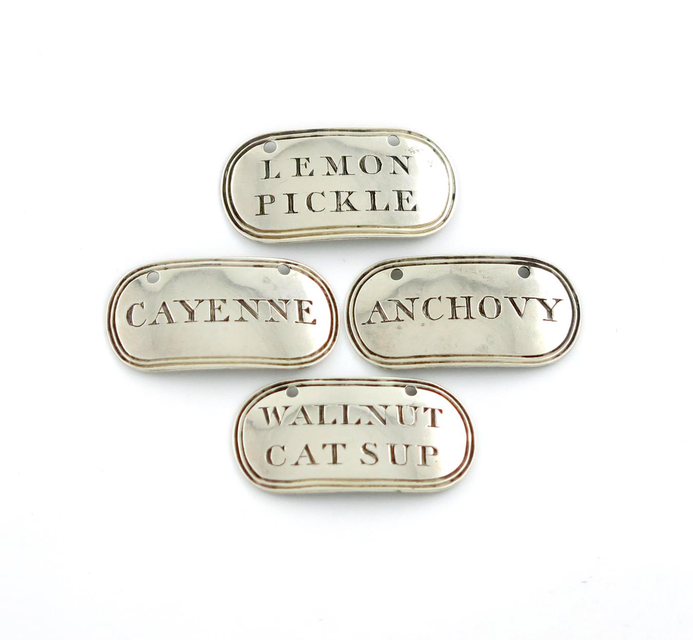 oblong form, reeded borders, incised 'WALLNUT CATSUP', 'LEMON PICKLE', 'ANCHOVY' and 'CAYENNE'. length 3.2cm, approx. weight 0.3oz. (4)