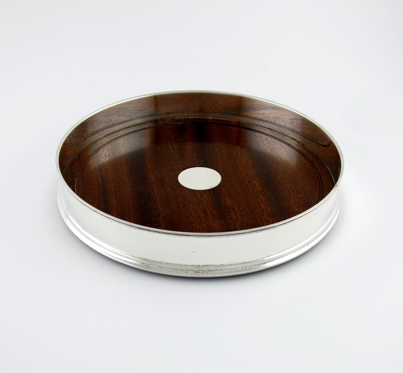 circular form, beaded border, the wooden base set with a silver button, diameter 26cm.