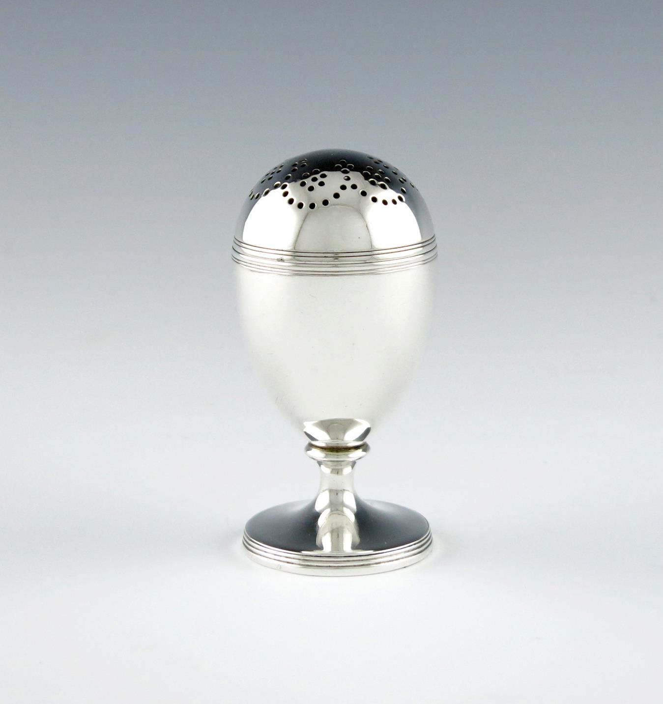 ovoid form, pull-off pierced cover, gilded interior, on a raised circular foot, height 8.5cm, approx. weight 1.9oz.