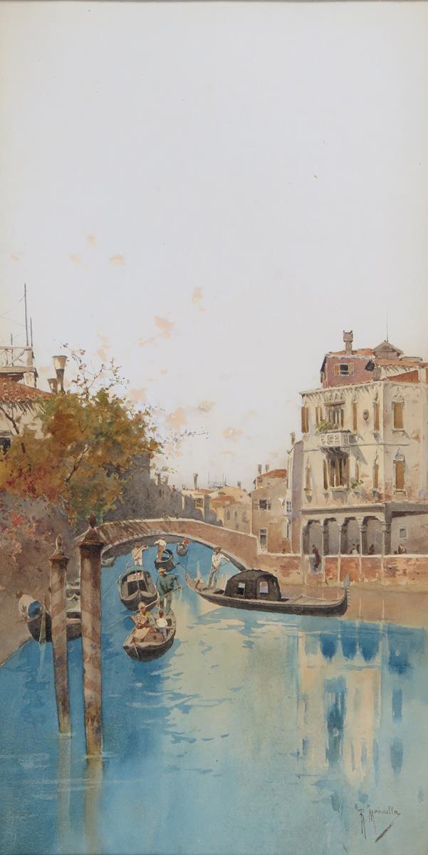 Raffaele Mainella (Italian 1858-1907) Gondolas on a busy backwater