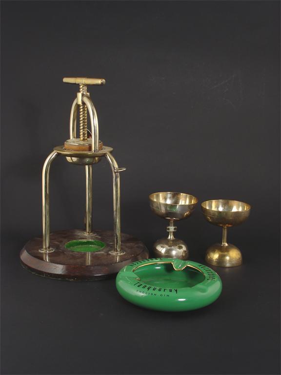 A bar top lemon squeezer with corkscrew twist, two reversible spirit measures and a Carlton ware Tanqueray ceramic ashtray unmarked 32cm. high