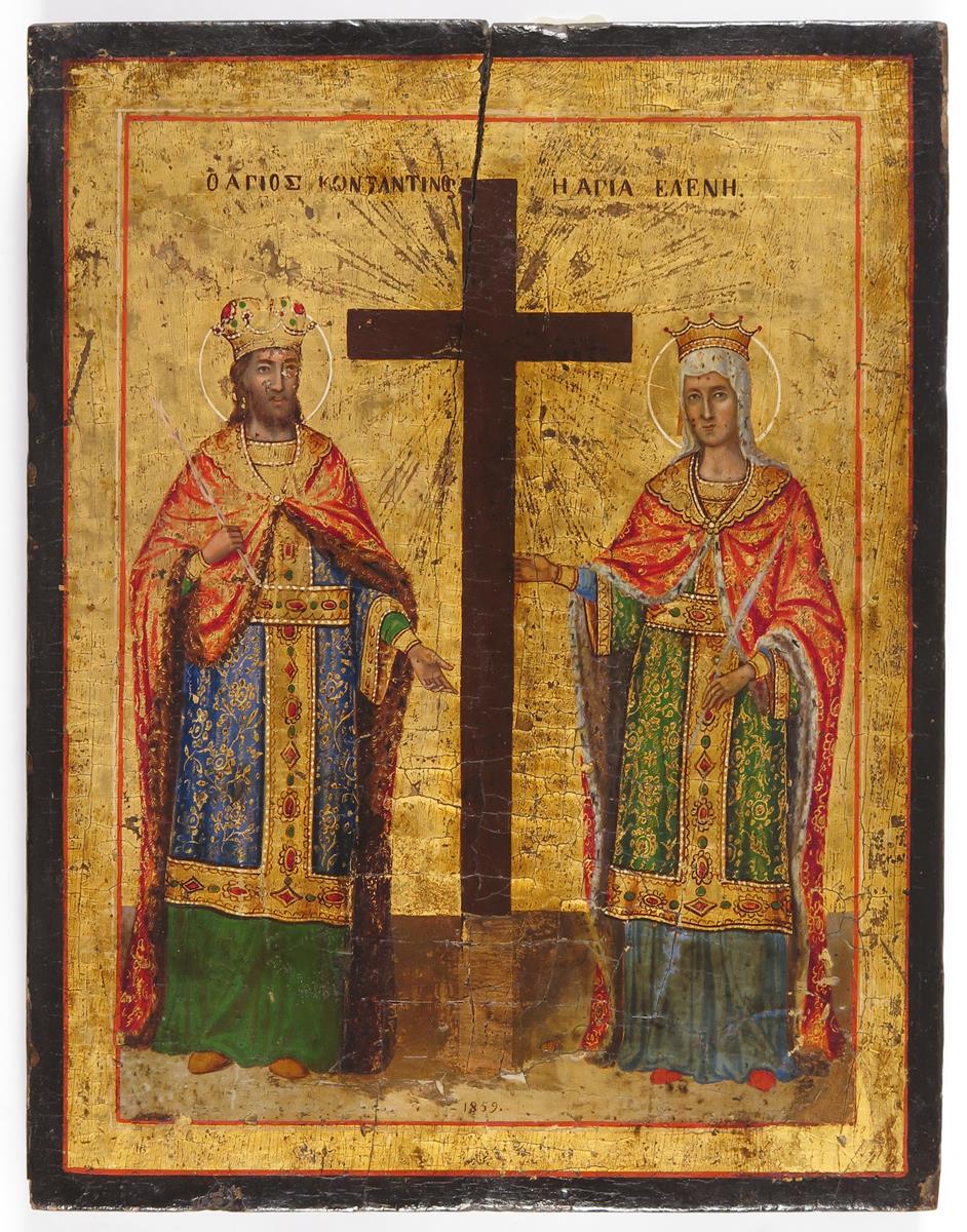 Greek School 19th Century Icon of Saints Constantine and Helena with the true cross Painted and...