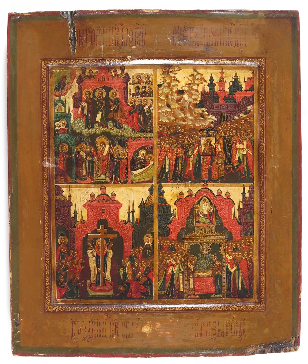 Quadripartite icon of The Pokrov; The Procession of the icon, Moscow; The Exaltation of the True Cross; The Installation of the Girdle of the Mother of God
