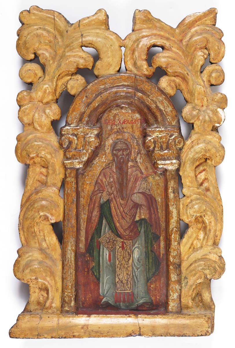 Full length portrait of a saint depicted holding the bible in a tabernacle frame