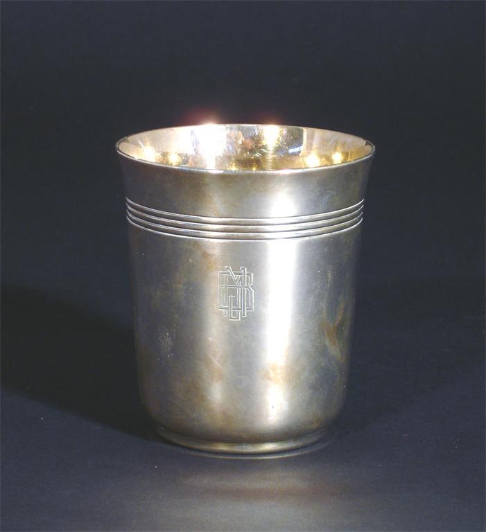 A Christofle electroplated beaker with grooved bands to neck stamped marks 8.5cm. high