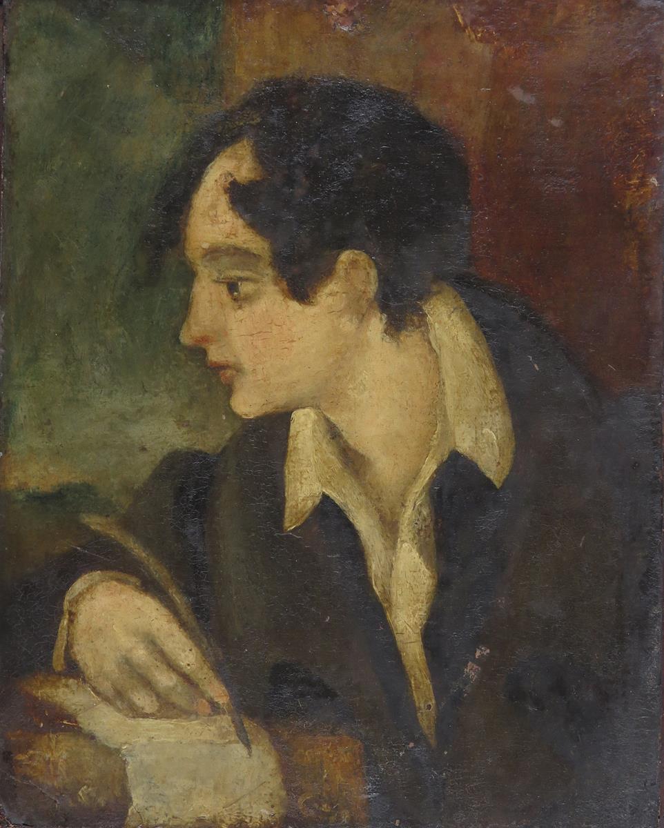 H. Dawson (18/19th Century) Portrait of Lord Byron writing Inscribed and signed verso Oil on panel