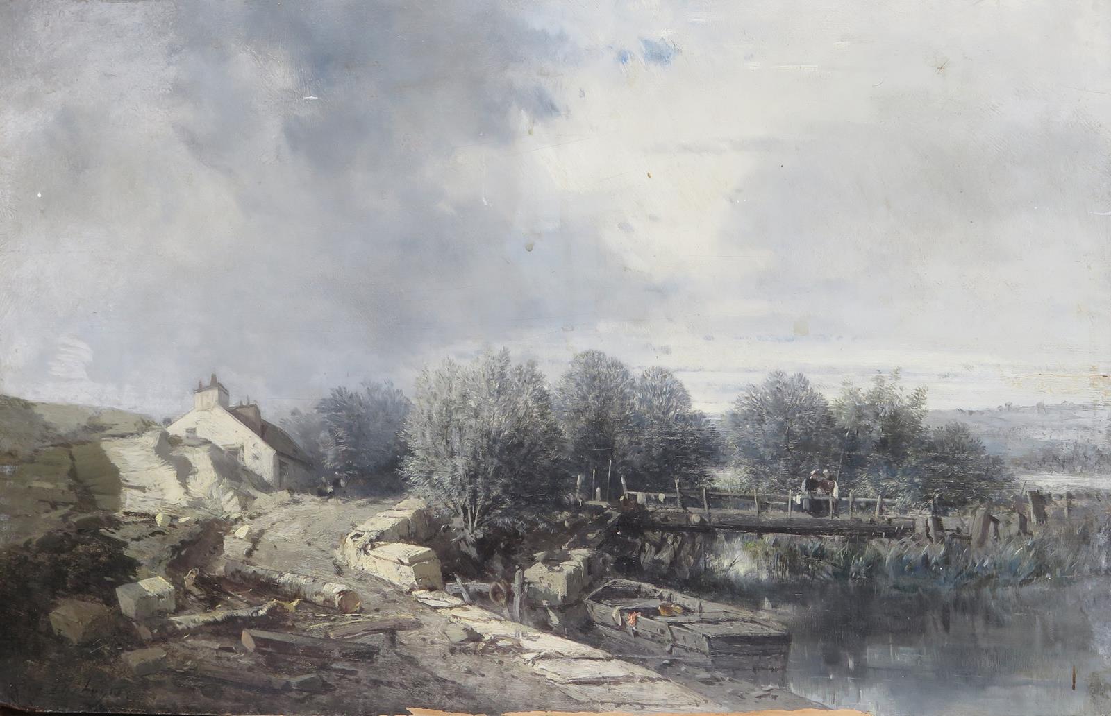 Eugène Deshayes (French 1828-1890) Figures by a bridge on a river Signed Oil on panel 32.5 x...