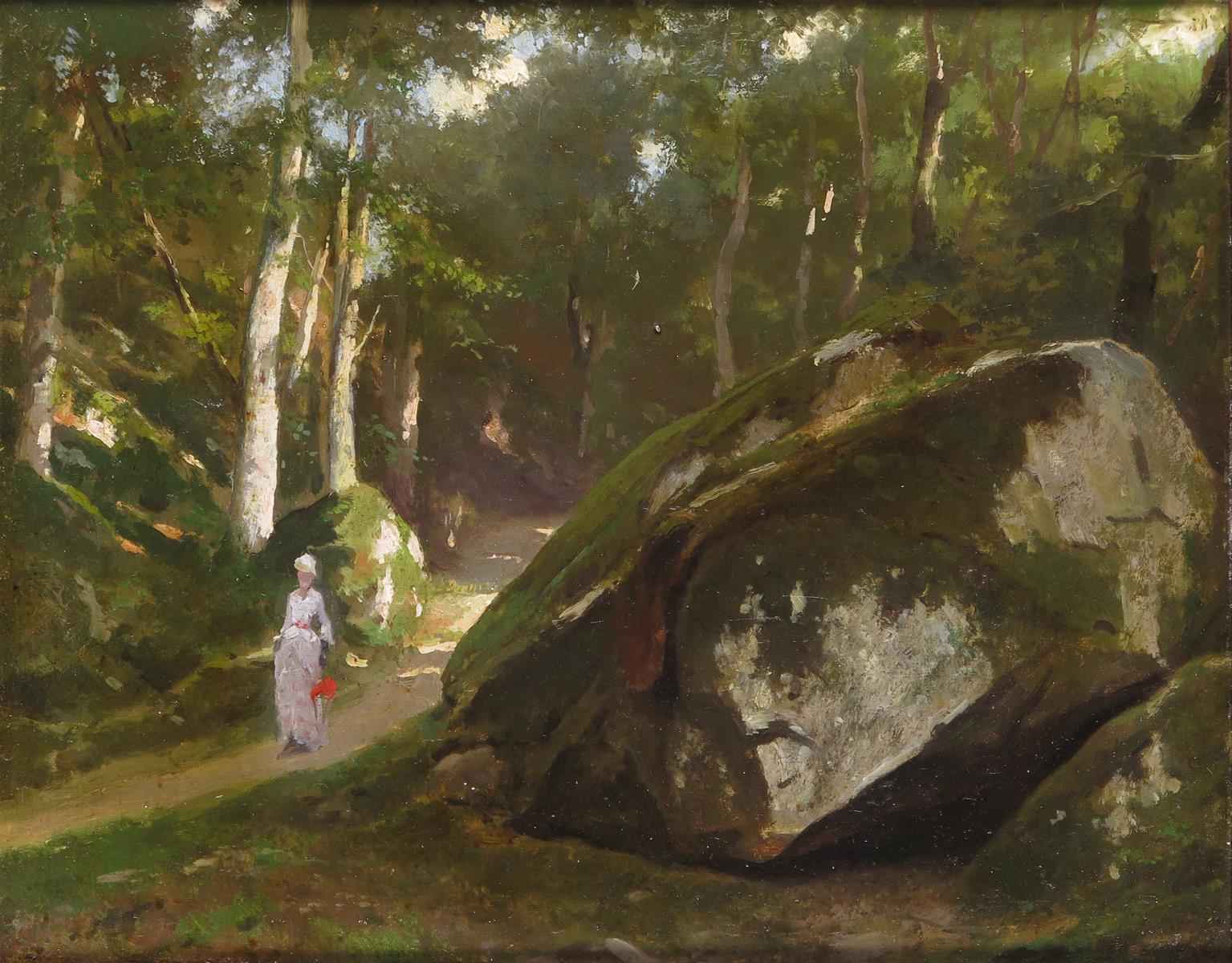 Eugène Pierre François Giraud (1806-1881) Elegant lady in a sunlit forest Oil on panel 33 x 41cm;...