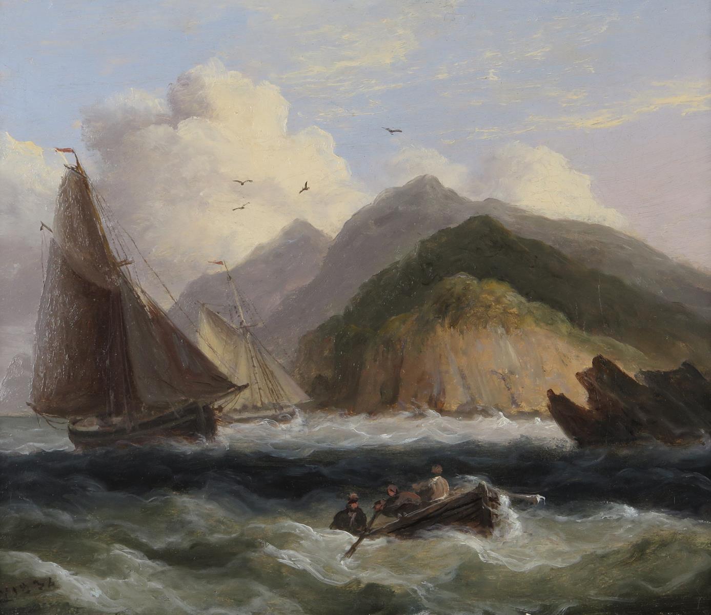 Thomas Luny (1759-1837) Fishing boats and figures in a rowing boat in choppy seas by a rocky...