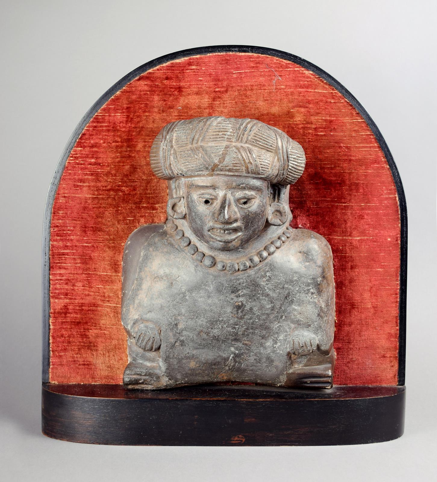 clay, modelled as a seated figure wearing a plaited headdress, disc ear ornaments, a bead necklace and a poncho,