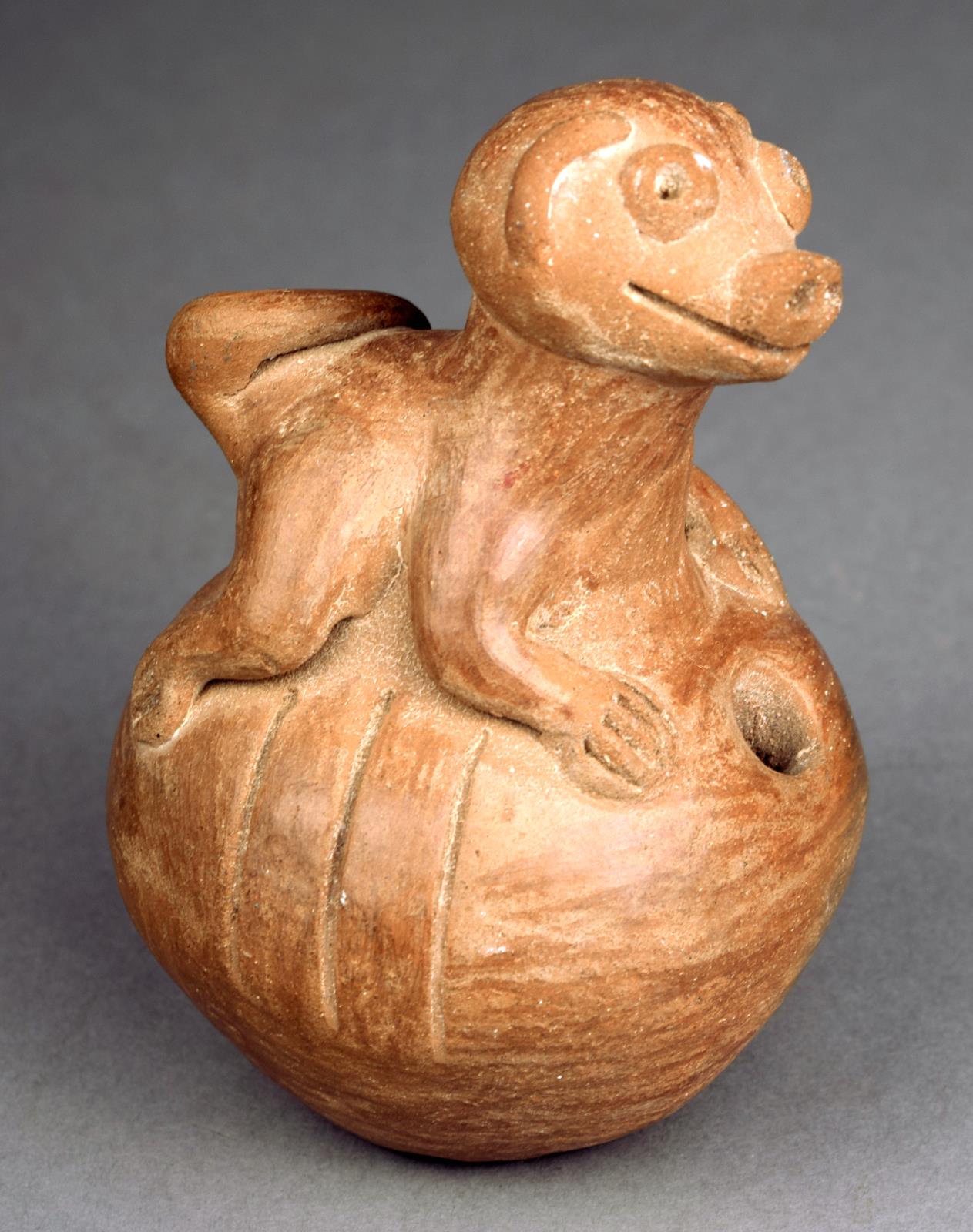 A Pipil vessel El Salvador ceramic of ovoid form with a hole to the front and with a recumbent dog