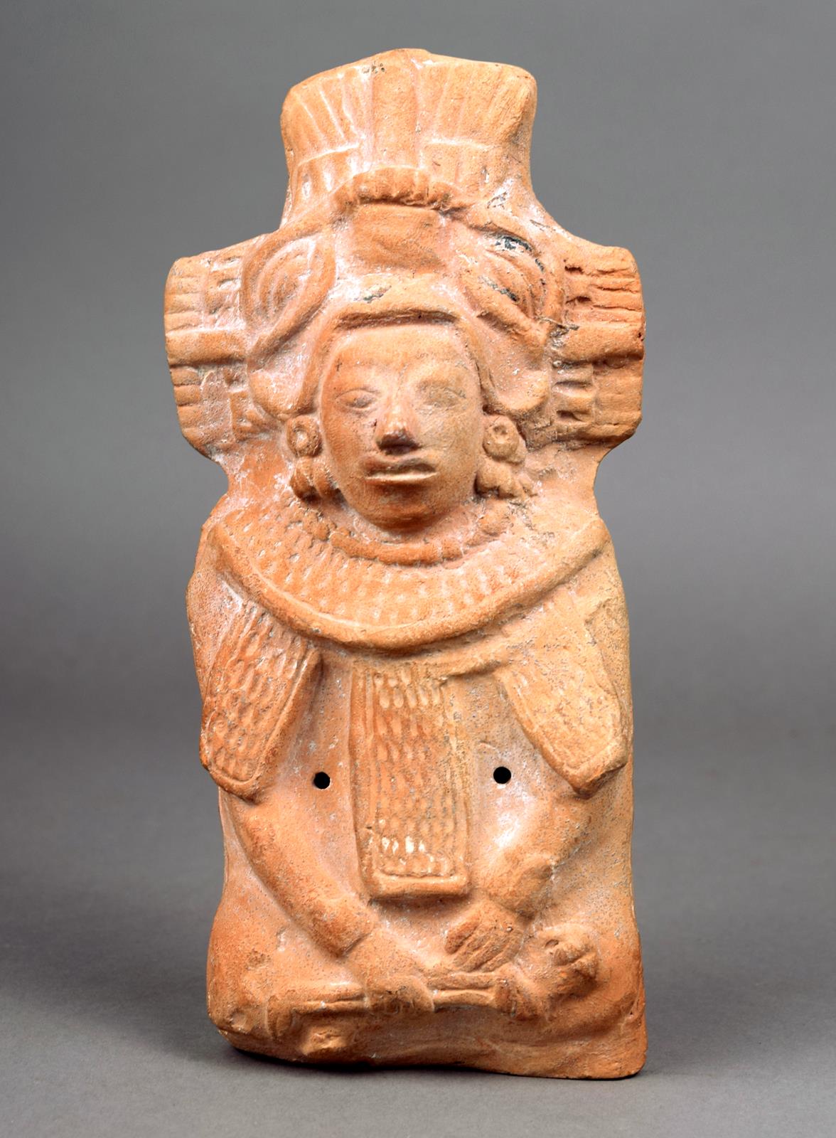 A Maya moulded rattle Mexico terracotta as a warrior wearing an elaborate headdress and necklace