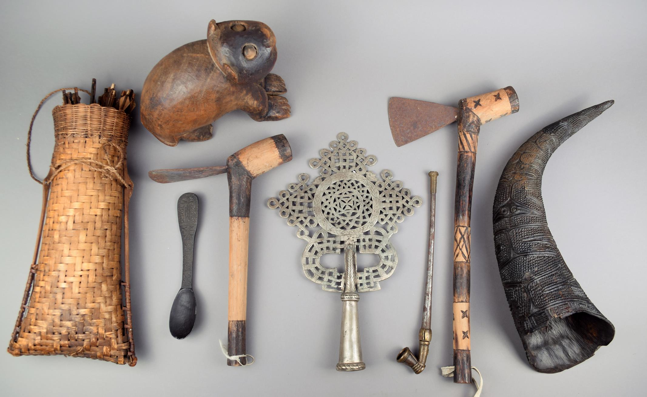 an Ethiopian processional cross, two axes, a Cameroon iron and brass pipe, a Somali spoon, a carved wood leopard and a quiver of arrows. (39)