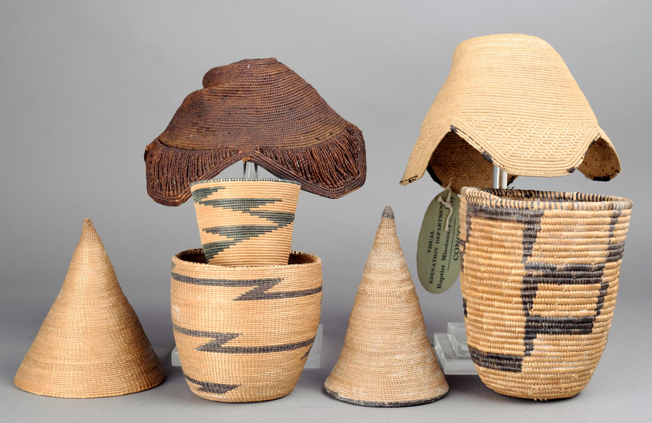 raffia, the lighter with printed label from Visual Education Department, Baptist Missionary Society, Congo and inscribed Chief's Hat.,