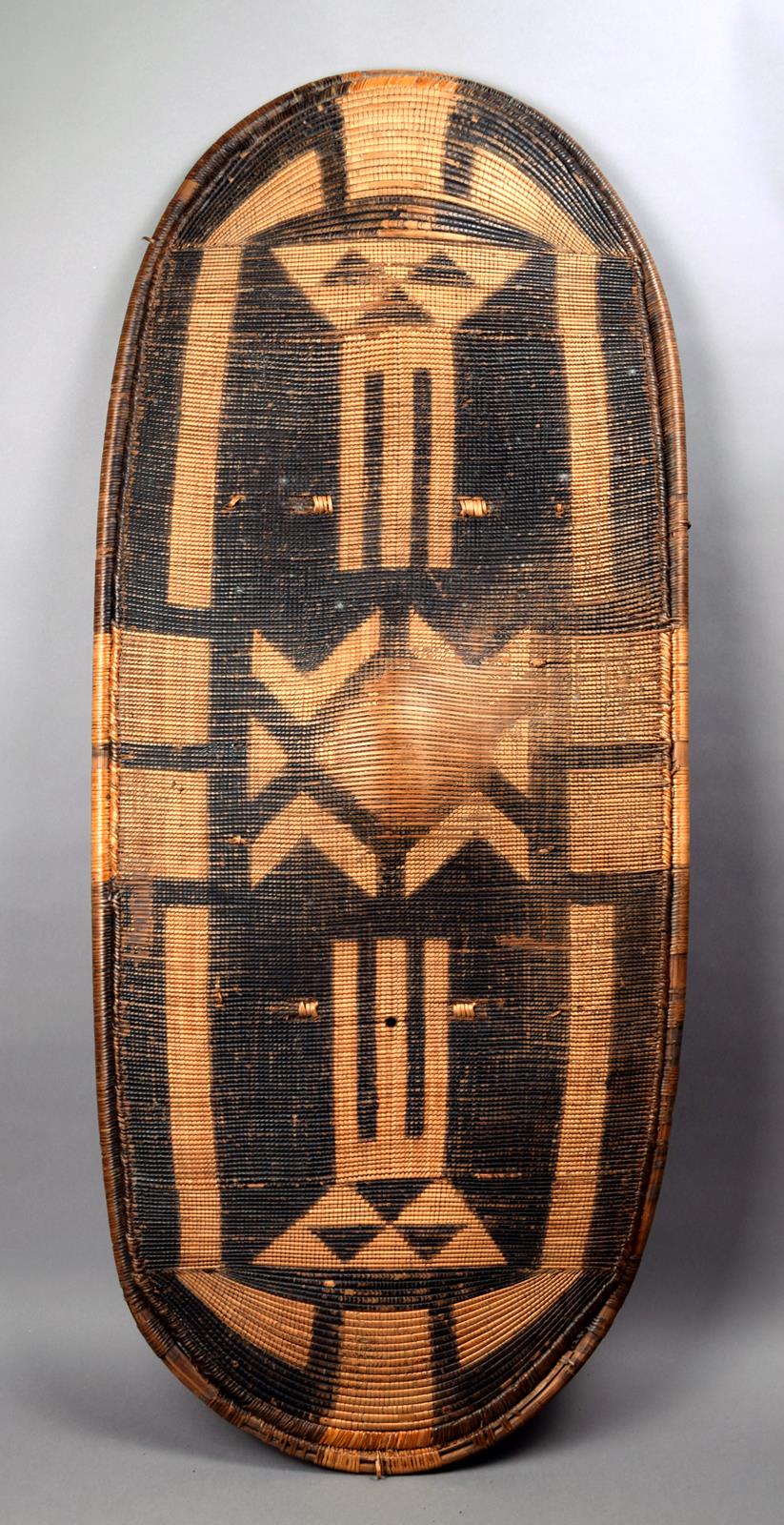 A Zande shield Democratic Republic of Congo basketry with geometric designs and central boss