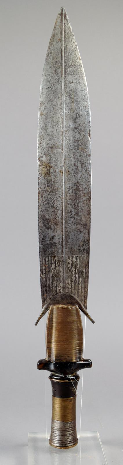 steel, wood and brass, the leaf shape blade with a medial ridge and incised eliptical decoration,