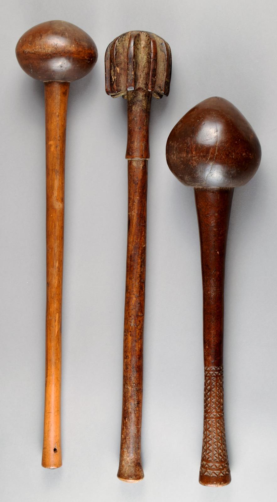 a Zulu knobkerrie, with a compressed spherical head and a Zulu butter churner, with a ribbed head. (3)