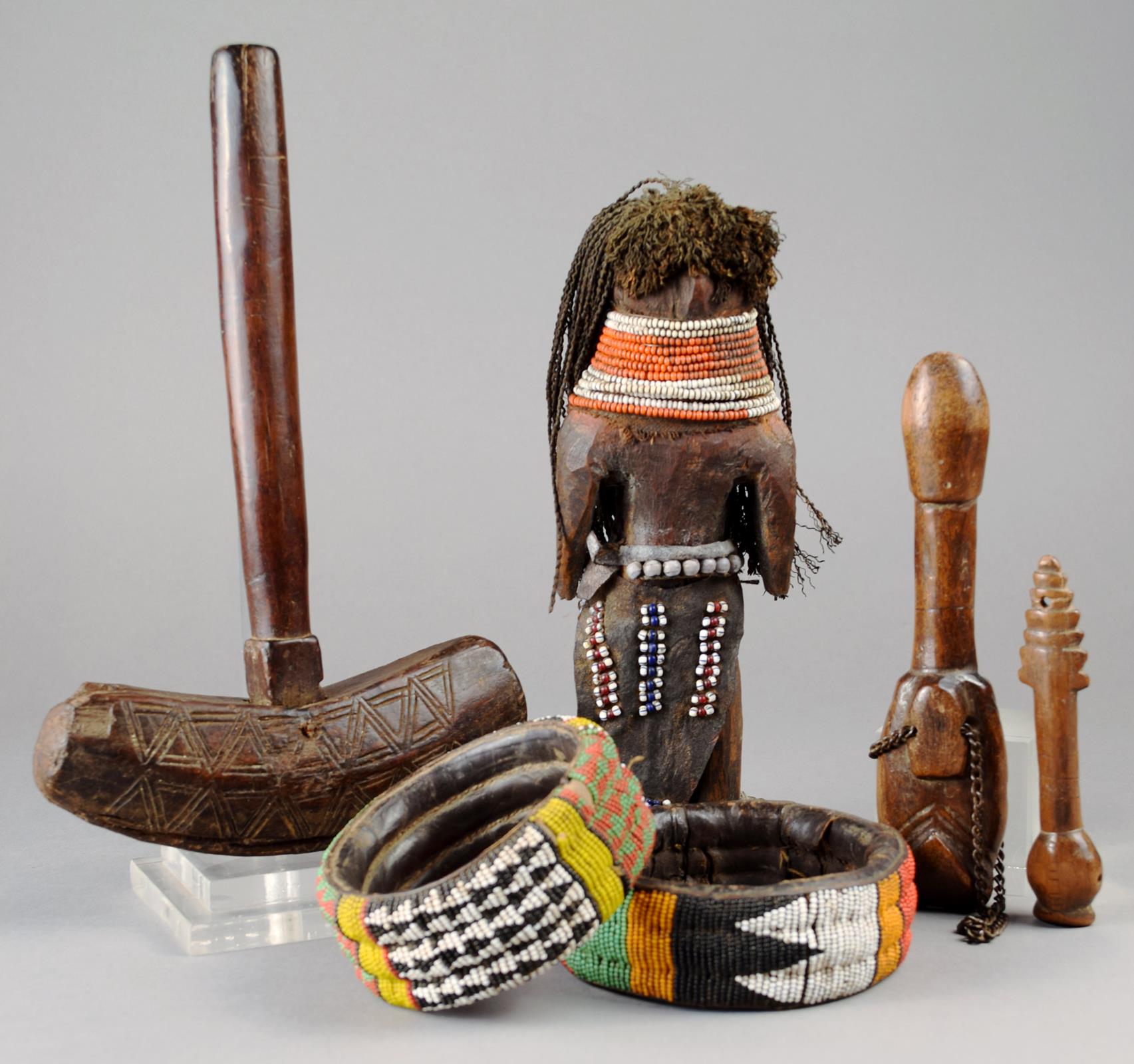 two Mossi whistles, one with a chain, a doll with beadwork and fibre hair and a West African sceptre shape beater. (6)