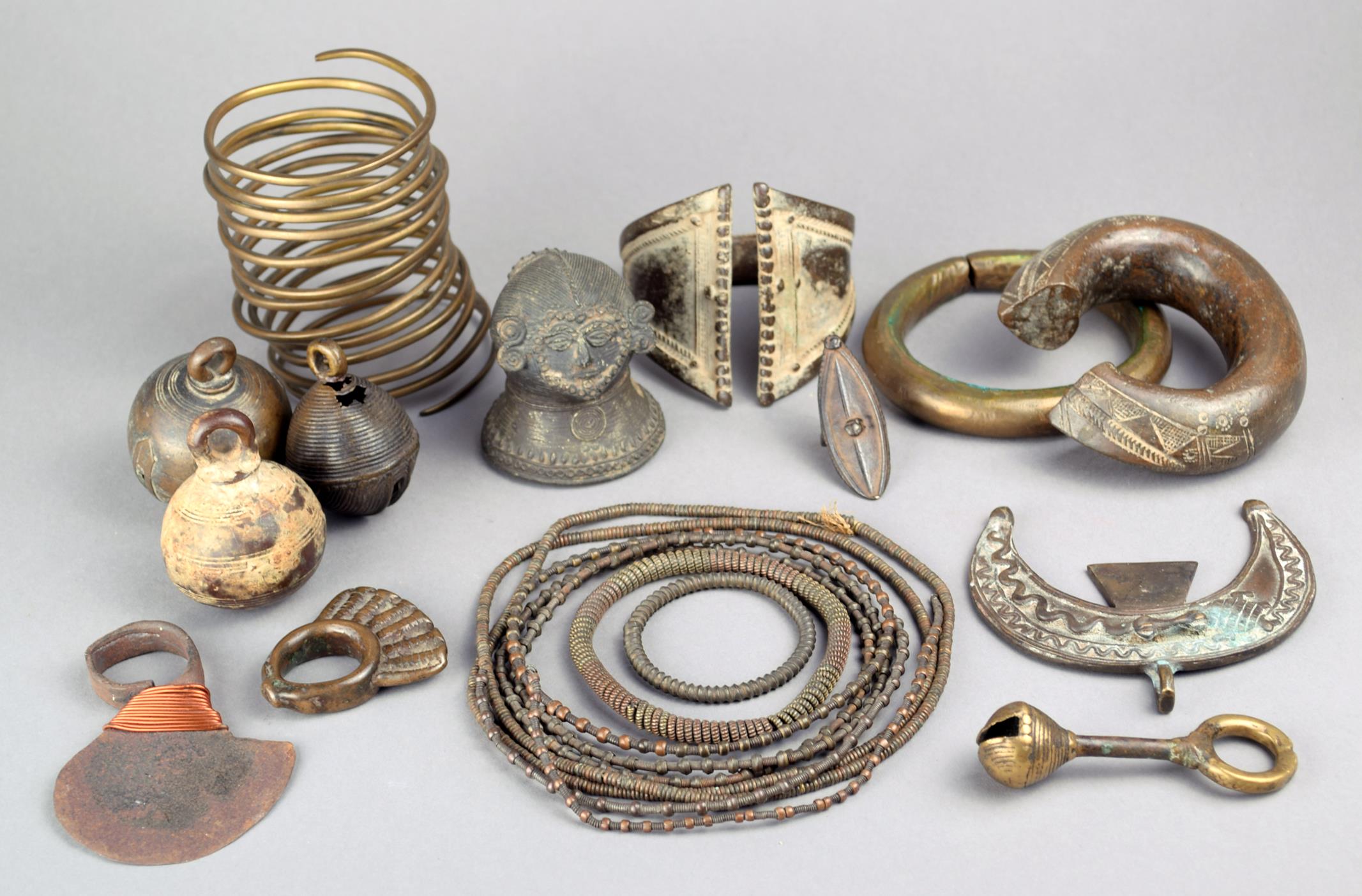 two bronze / brass currency bangles, a brass wire arm band, a Burkina Faso crescent pendant and a shield shape ring, an Ethiopian ring pendant, a ring with a blade, another with a bell, five brass wire bangles and a necklace, three bells and a small bust. (21)