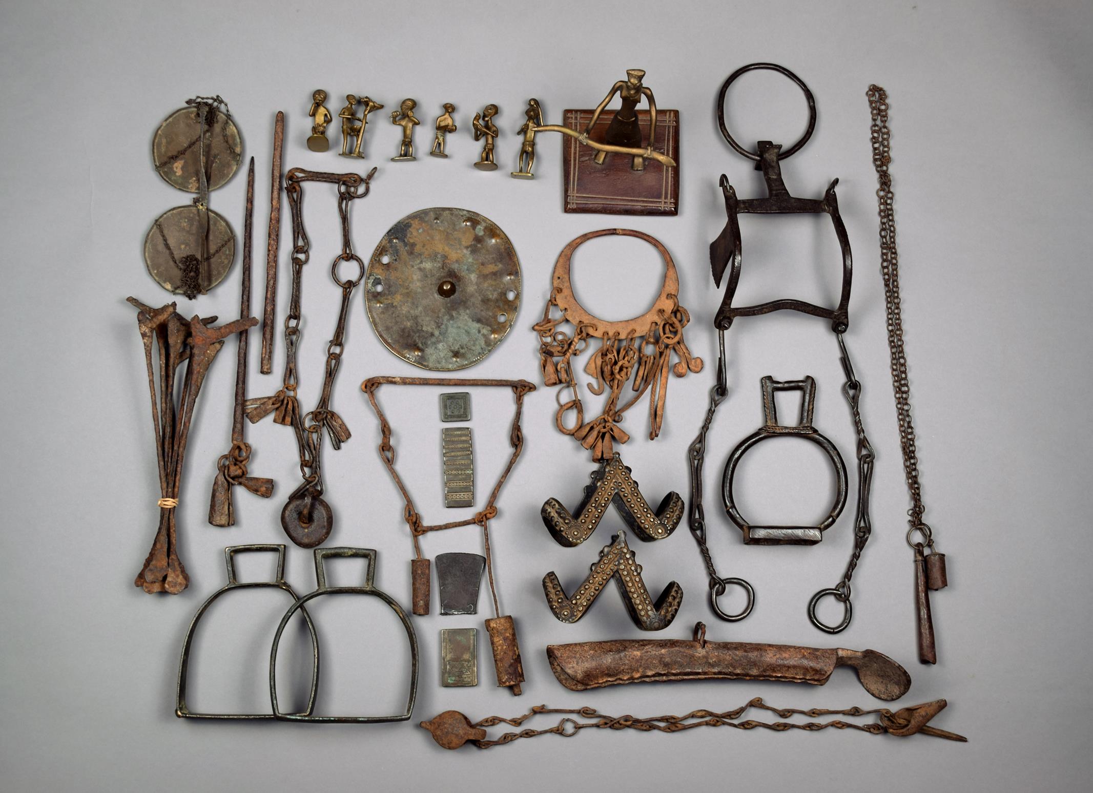 four similar chains, seven Liberian iron Buji currency, a West African horse ring bit, a Nigerian currency hoe, a rod with two bells, a pair of brass anklets, a pair of brass stirrups, a single stirrup, a Dahomey brass figure holding a serpent, six Akan brass figures, three brass weights, a set of brass scales and an oval brass pendant with a central boss. (34)