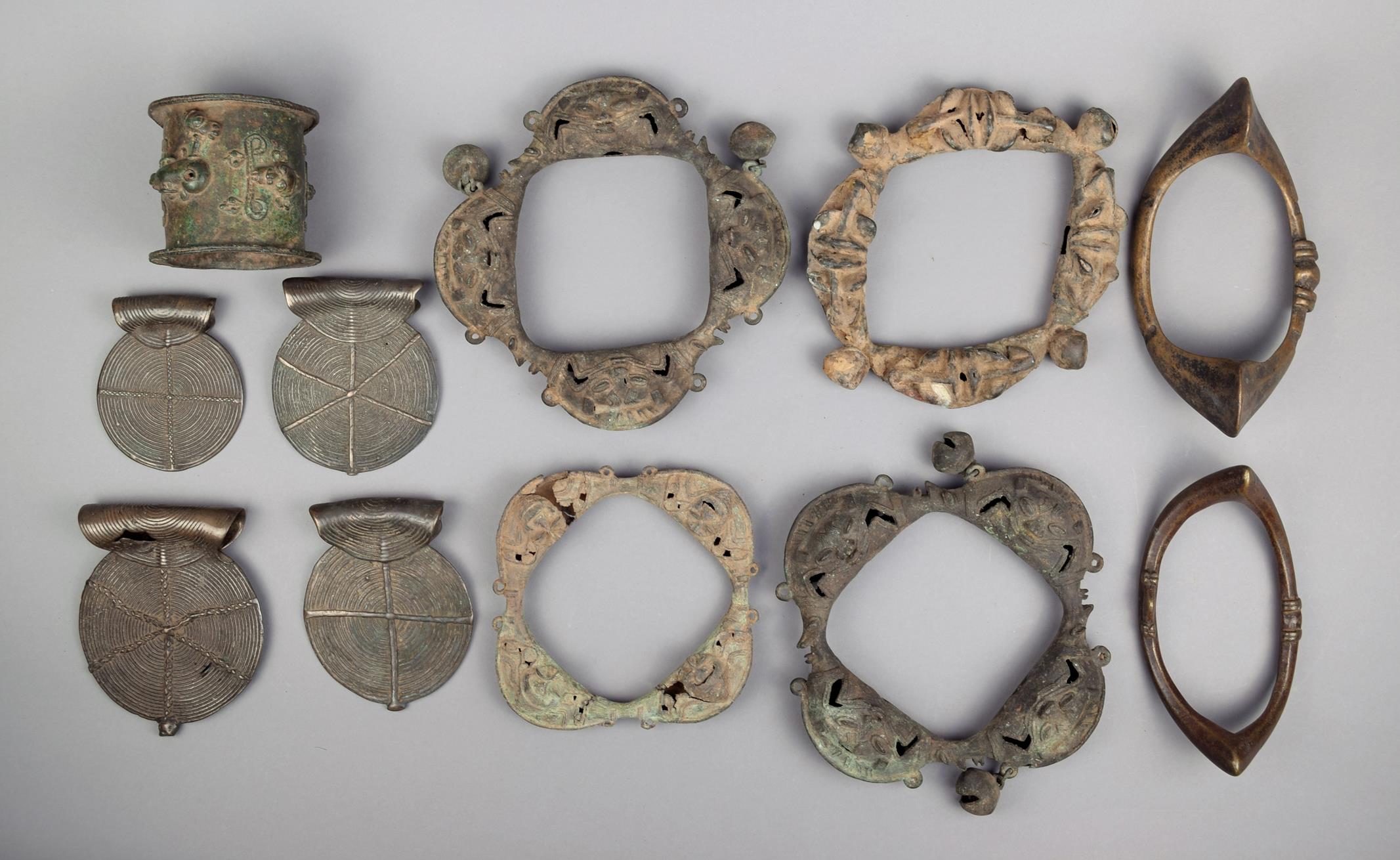 a Yoruba brass armband, four brass disk pendants and two anklets. (11)