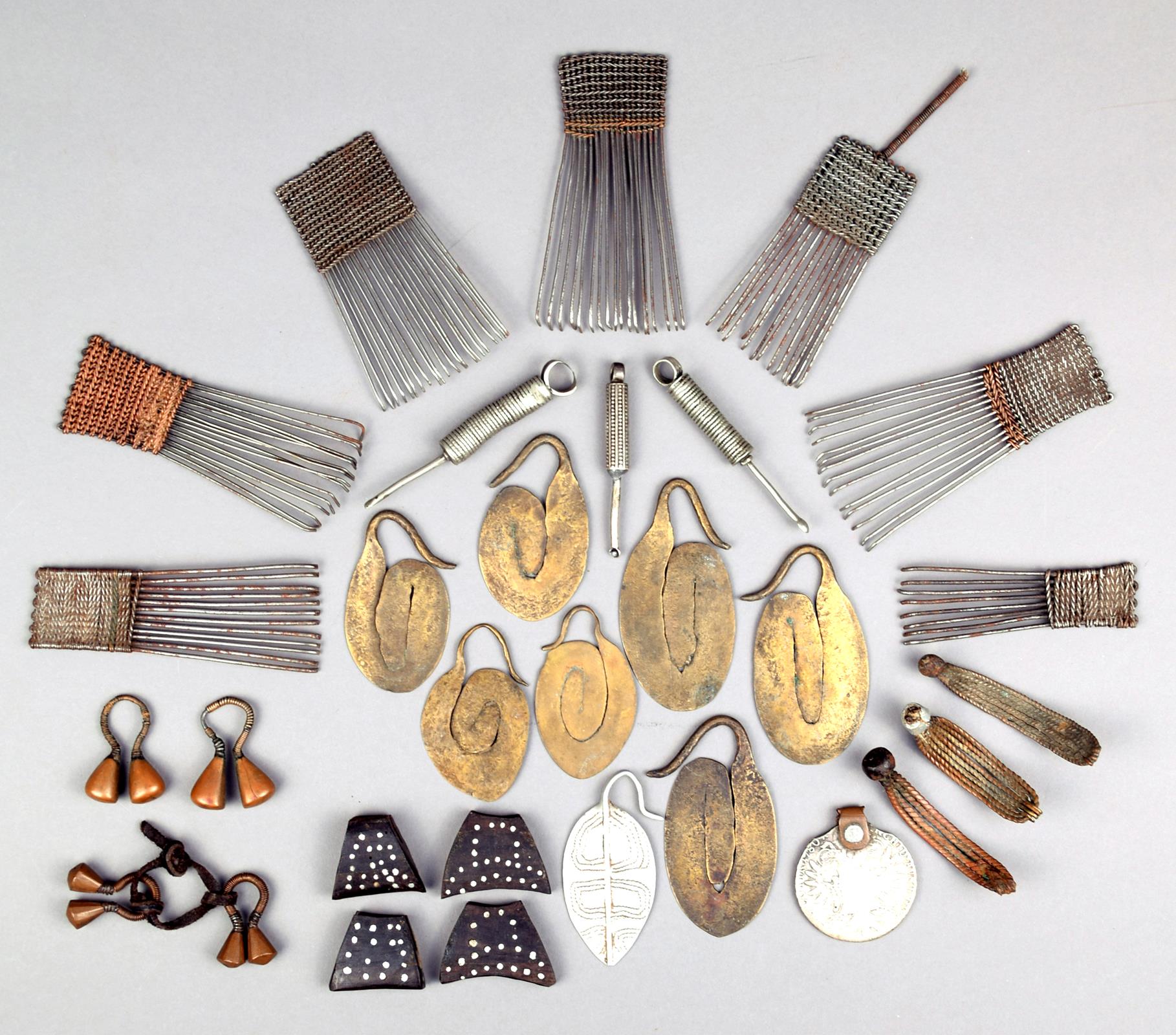 three Ethiopian ear scrapers, three Kenyan wirework lip plugs, two pair of Turkana brass earrings, three pairs of Kenyan brass earrings, two others in brass and aluminium, two pairs of wood and aluminium ornaments and a Maria Theresa thaler neck ornament. (30)