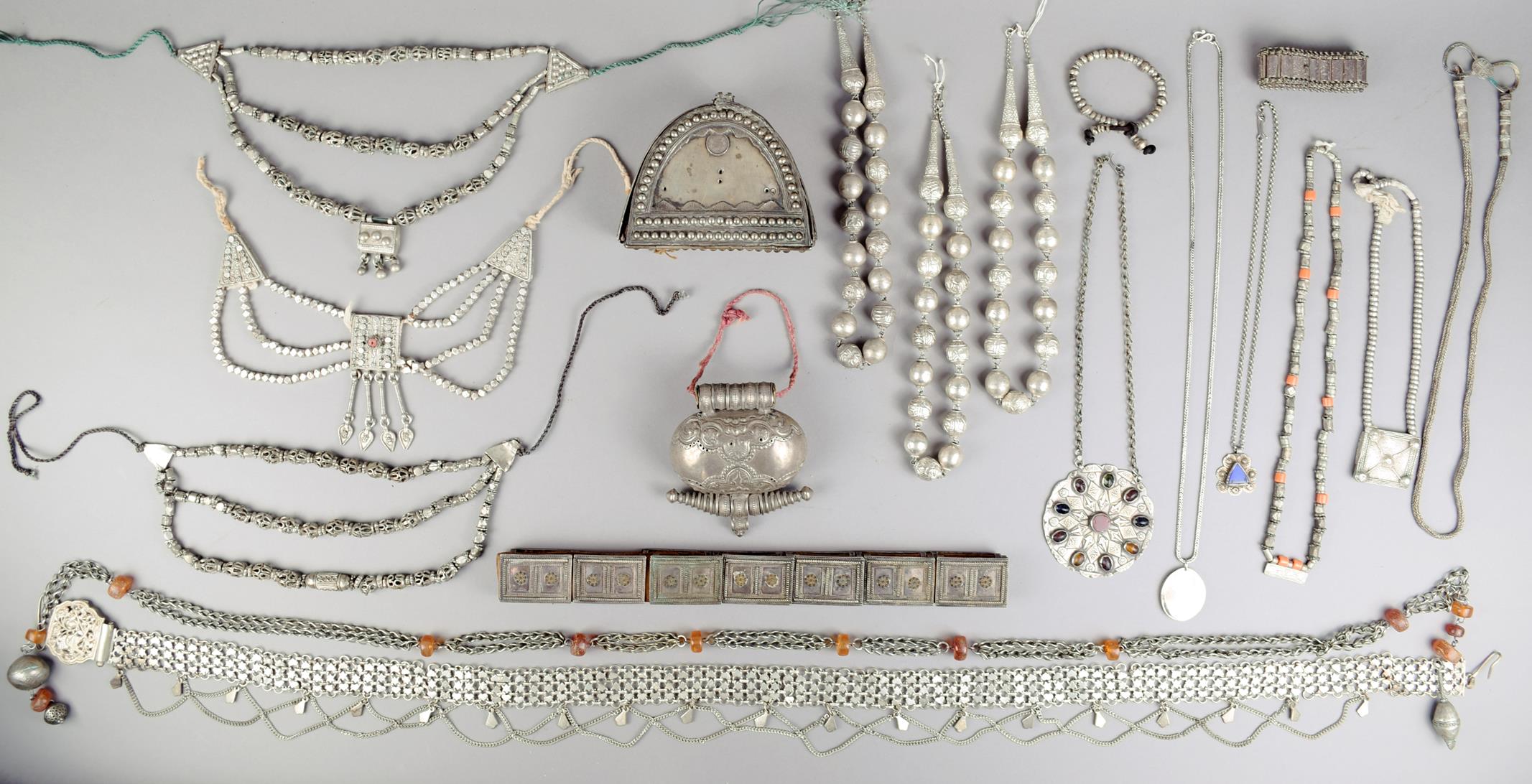 Ten Ethiopian necklackes silver coloured metal and paste