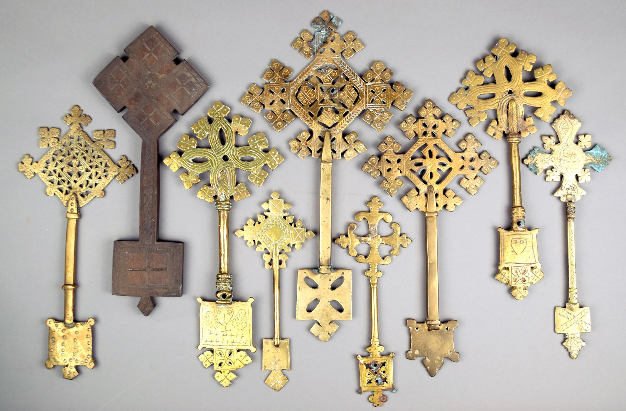 Nine Ethiopian Coptic crosses eight brass with pierced and incised decoration and one wood