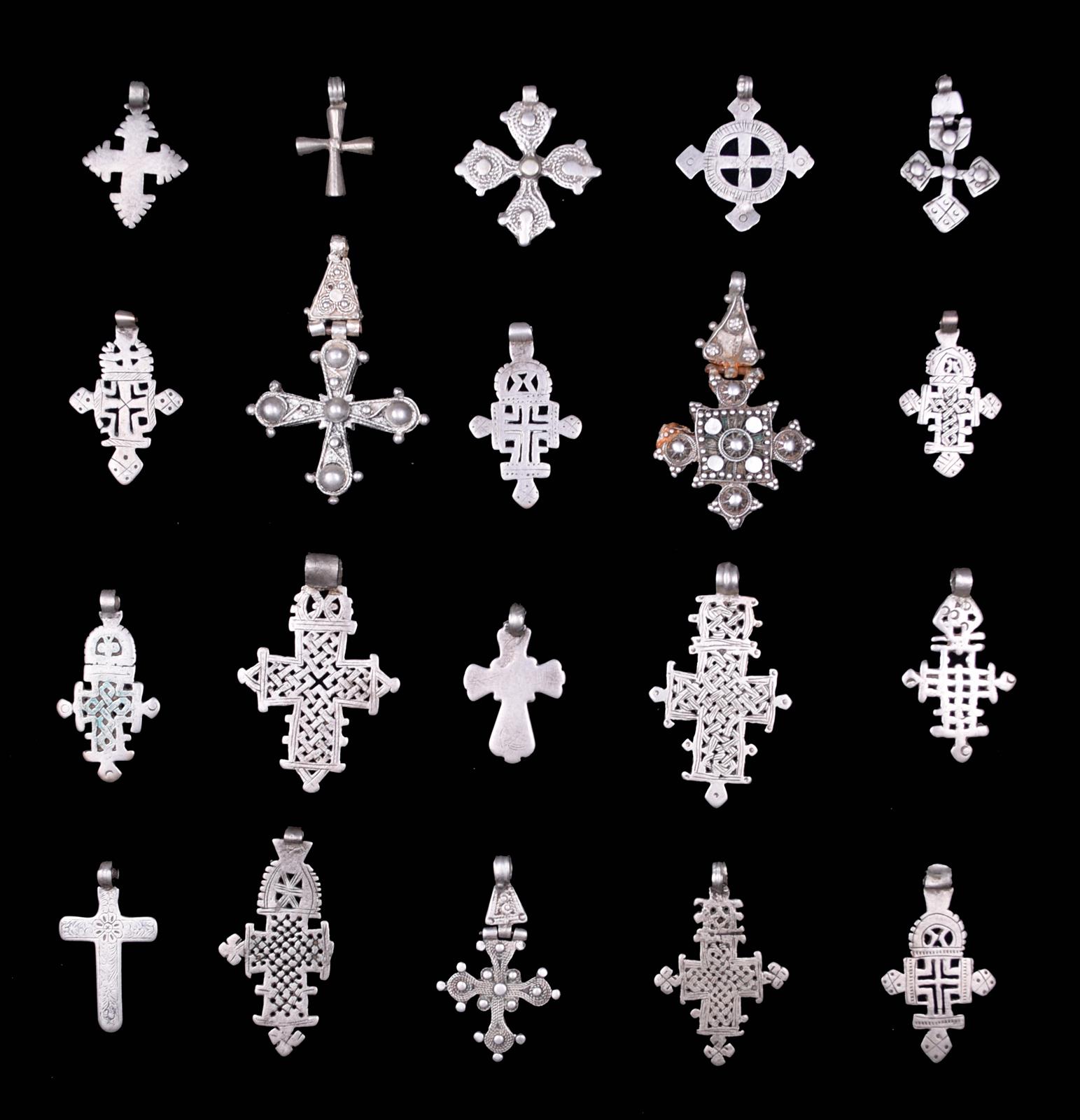Twenty Ethiopian Coptic cross pendants silver coloured metal