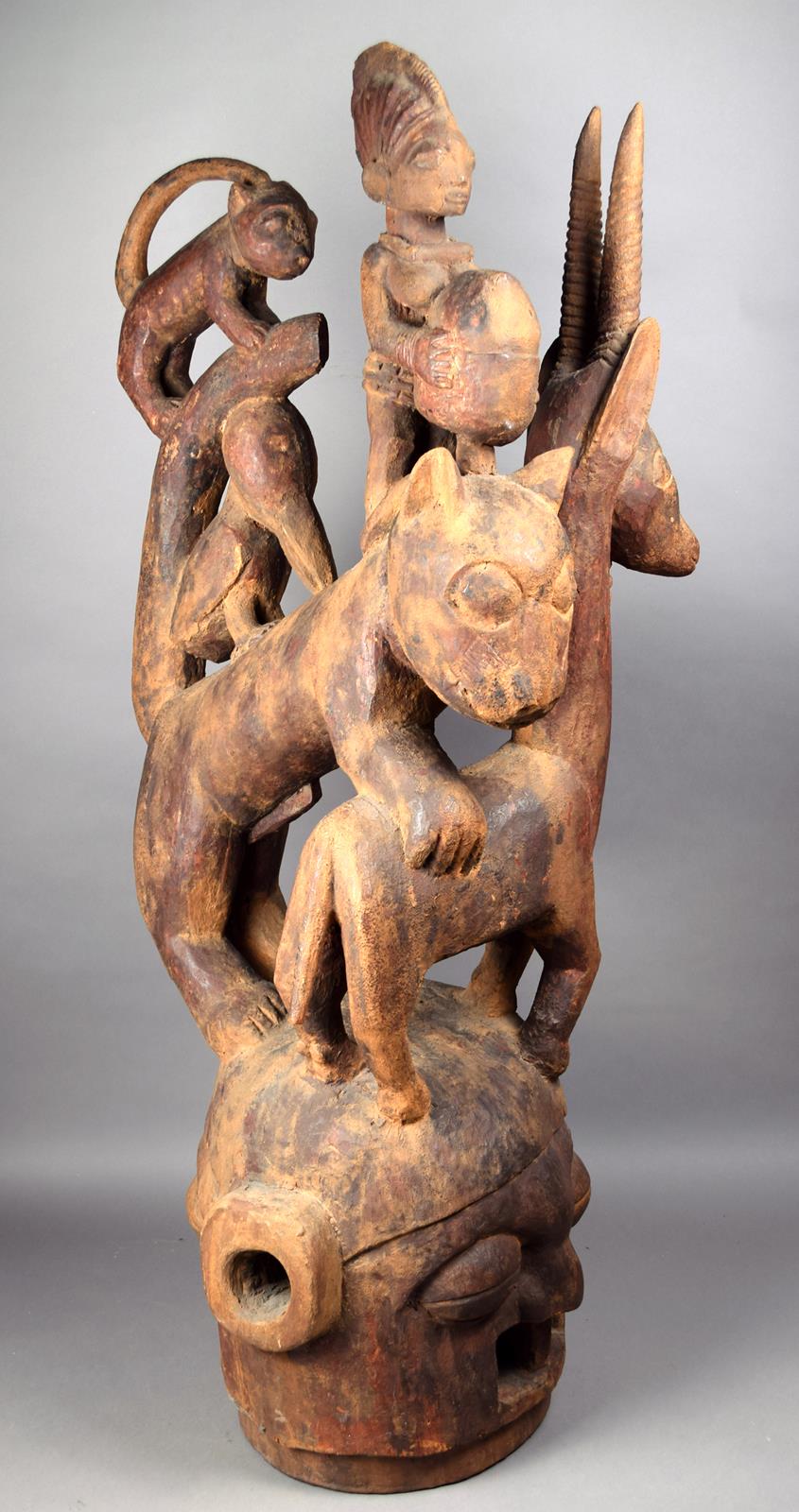wood, surmounted with an antelope, leopard, a standing female offering figure, a bird and a leopard cub,