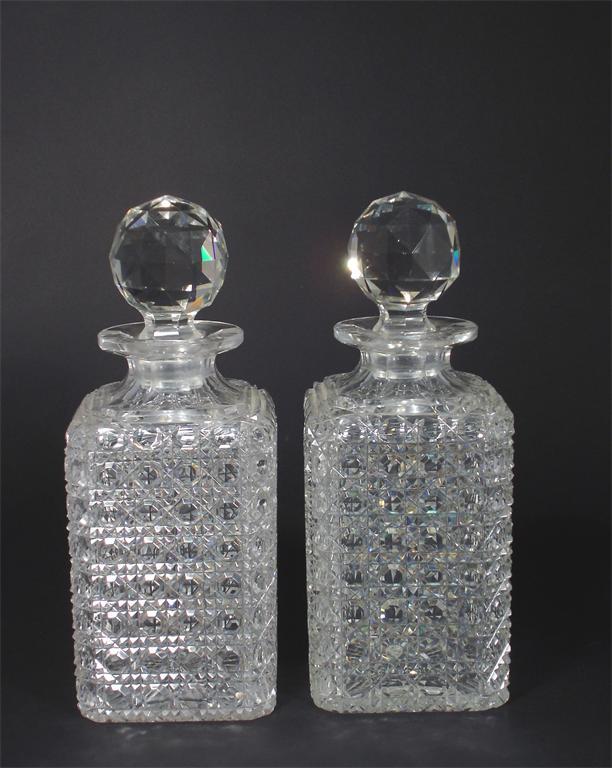 A pair of Mappin & Webb square section cut decanters with faceted ball stoppers 25cm. high