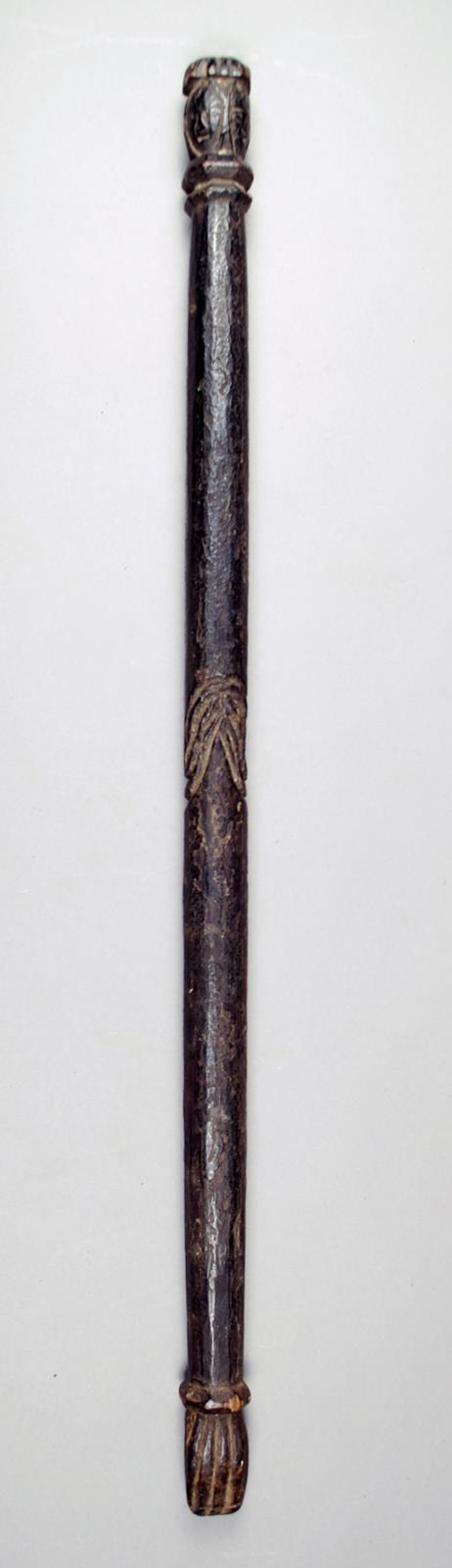wood with an encrusted finish, the finial with four masks, the faceted staff with a waved ribbed section to a hand terminal,