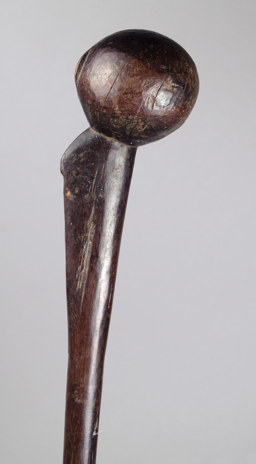 A Gogo knobkerrie Tanzania wood with a spherical head having a short crest to the back on a...