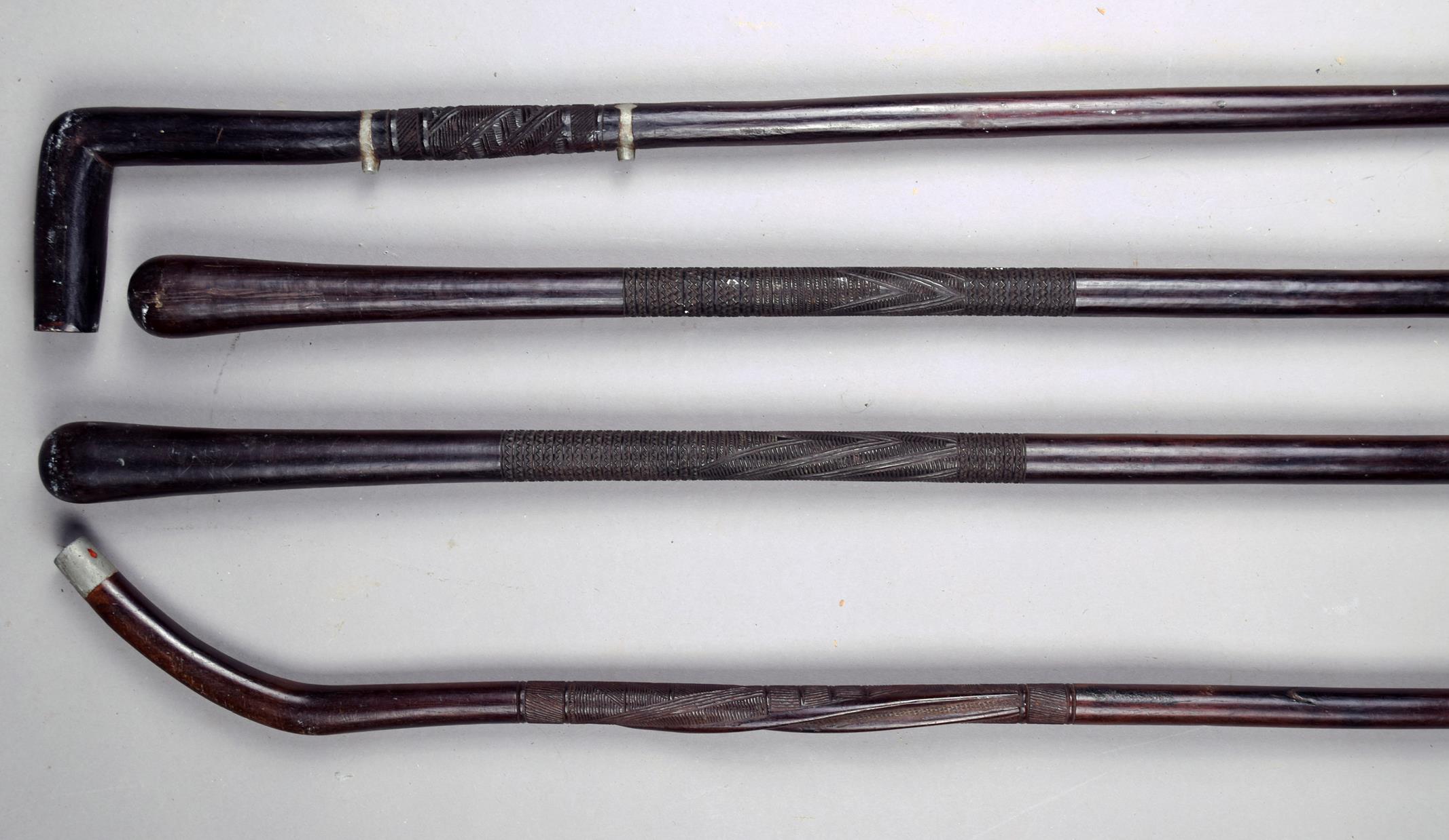 wood, with carved zig-zag and linear decoration, two with pewter mounts, with handwritten labels,