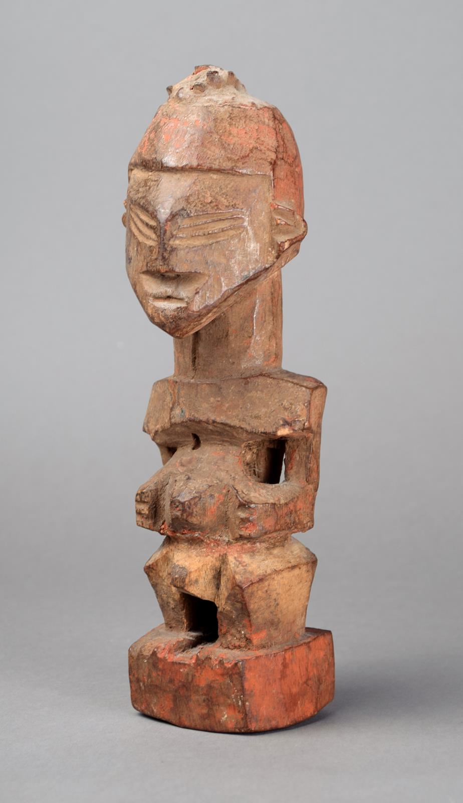 wood with charge to the top of the head and with a red ochre and encrusted patina,