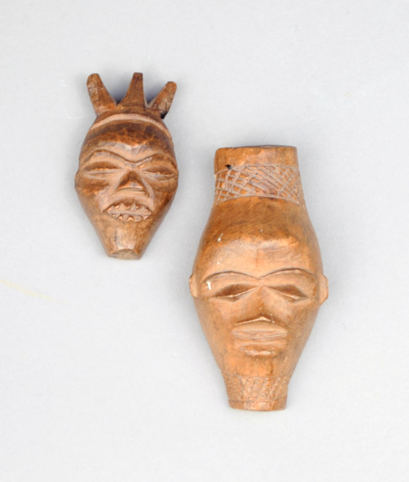 Two Pende Ikoko pendants Democratic Republic of Congo one with a triple spiked coiffure and filed...
