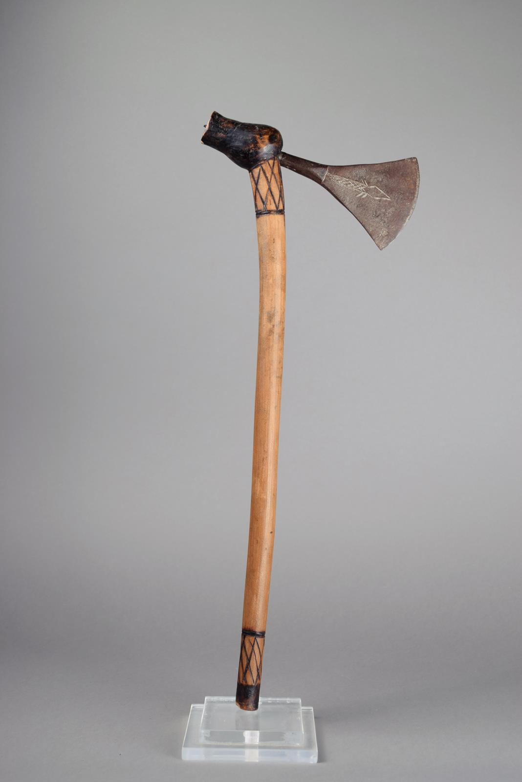 A Ila axe Zambia the wood shaft with burnt decoration and a with an iron blade with incised...